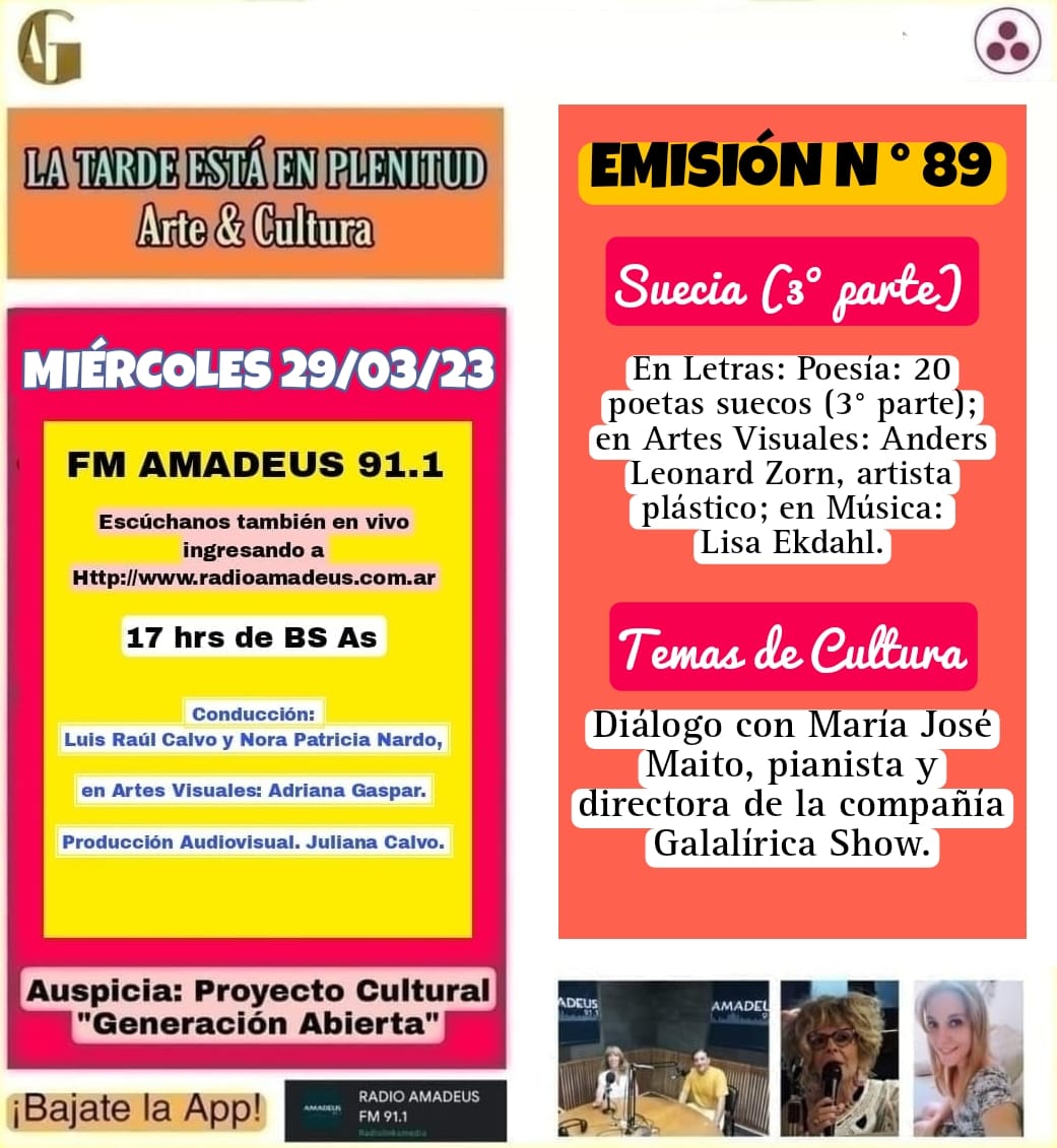 En Letras: Poesía: 20 poetas suecos (3° parte); en Artes Visuales: Anders Leonard Zorn, artista plástico; en Música: Lisa Ekdahl.