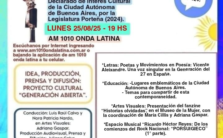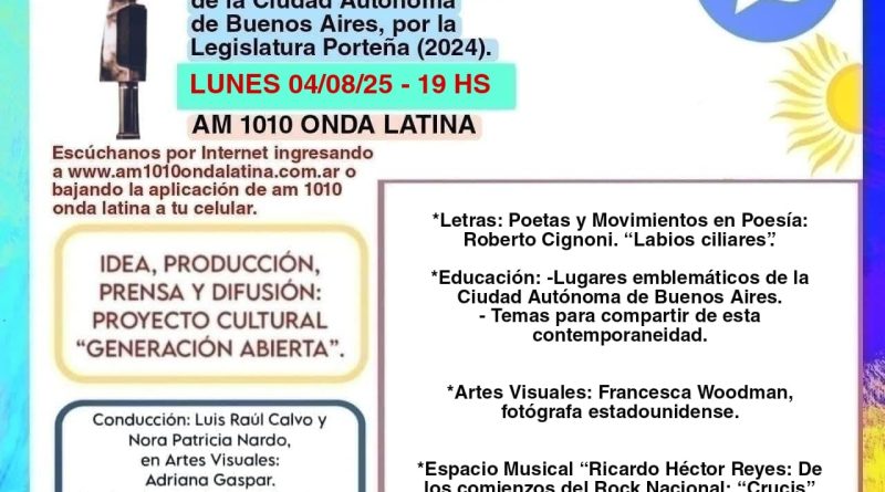 Leer más“Generación Abierta en Radio” -Letras-Arte-Educación- Declarado de Interés Cultural de la Ciudad Autónoma de Buenos Aires, por la Legislatura Porteña